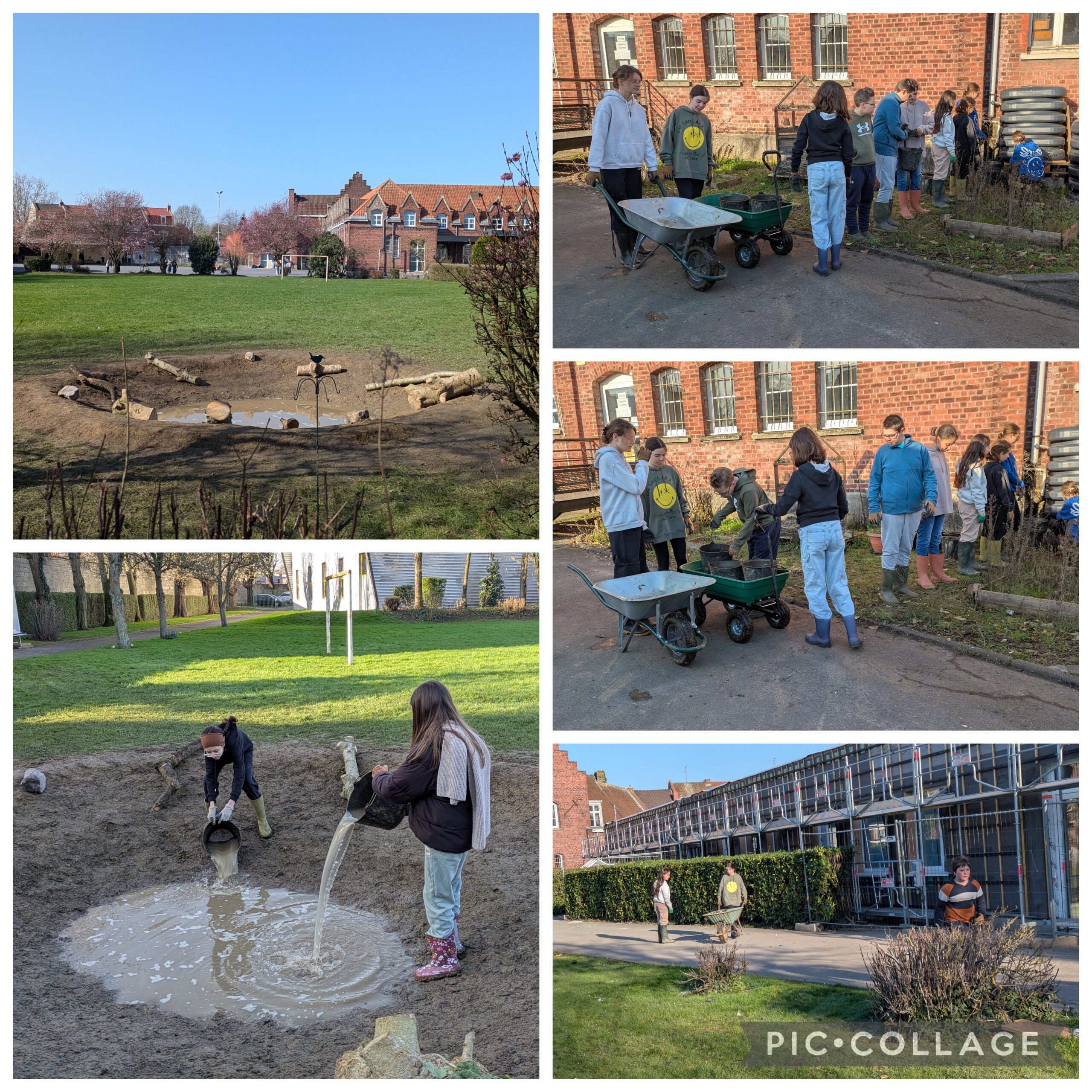 A la force des bras, à l’aide de brouettes et avec beaucoup de coopération,certains élèves se sont amusés à transporter l’eau du récupérateur d’eau de pluie jusqu’à la mare asséchée sans perdre une goutte.